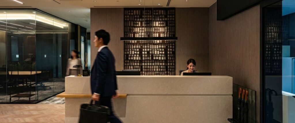 The soul of design is often hidden in the details. In the design of the Reception area, the background wall features a dark grille design. This is clearly a tribute to the traditional Japanese architectural element—“Kumiko” or “Shoji” (grille or screen).
