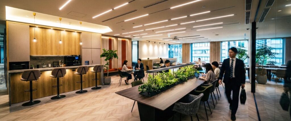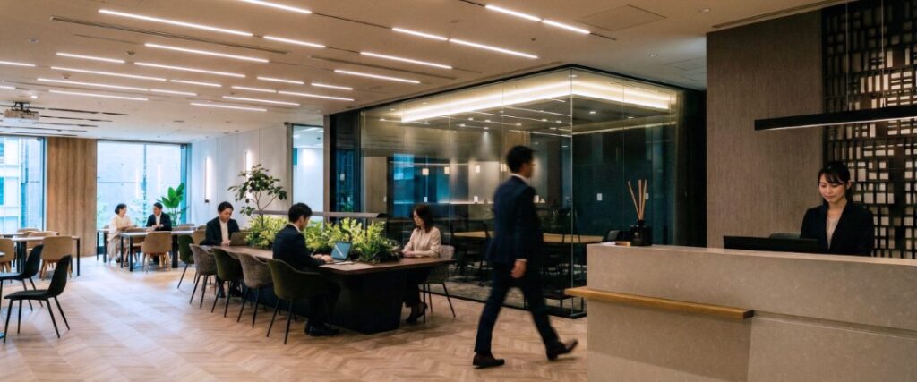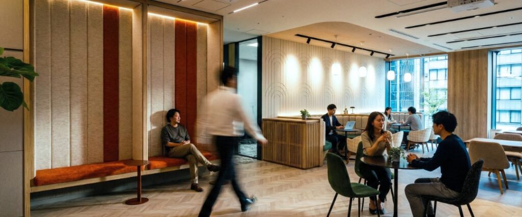 The designers did not merely copy the traditional style but simplified it into modern geometric lines, paired with the minimalist horizontal lines of the counter in front, presenting a sense of order filled with “Zen.” This fusion of old and new allows visitors to subconsciously feel “This is in Japan” upon entry, experiencing a deep connection between an international workspace and local culture.