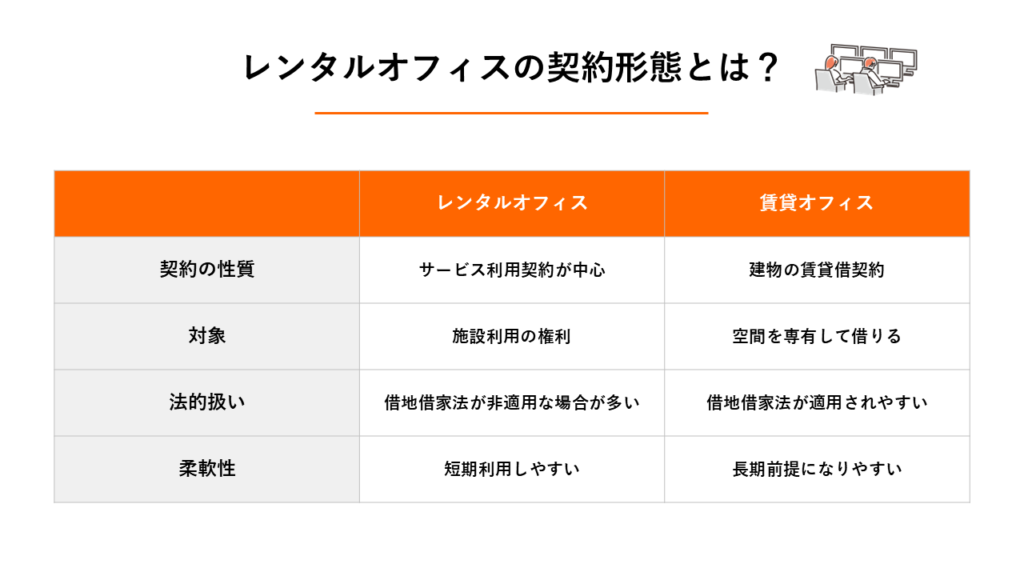 レンタルオフィスと一般的な賃貸オフィスでは、契約の性質そのものが異なります。