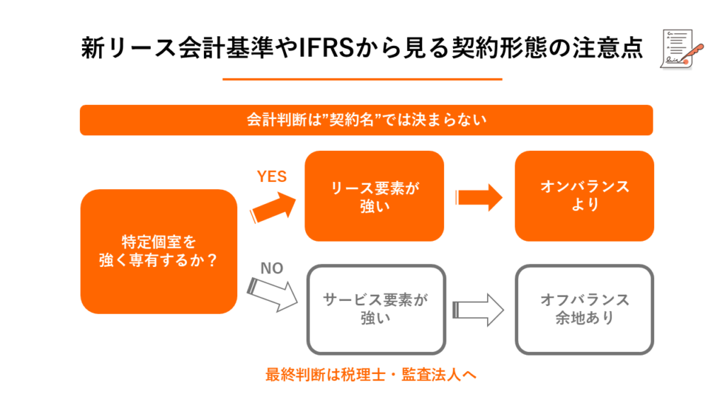 例えば、特定の部屋を長期にわたって完全に専有し、契約変更の自由度も低い場合は、実質的なリースと見なされるリスクがあります。