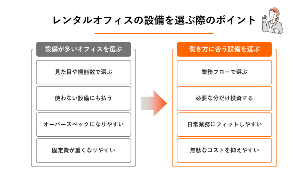 レンタルオフィスの設備は、豪華さよりも日常的に使いやすく、入居企業の働き方に合っていることが大切です。